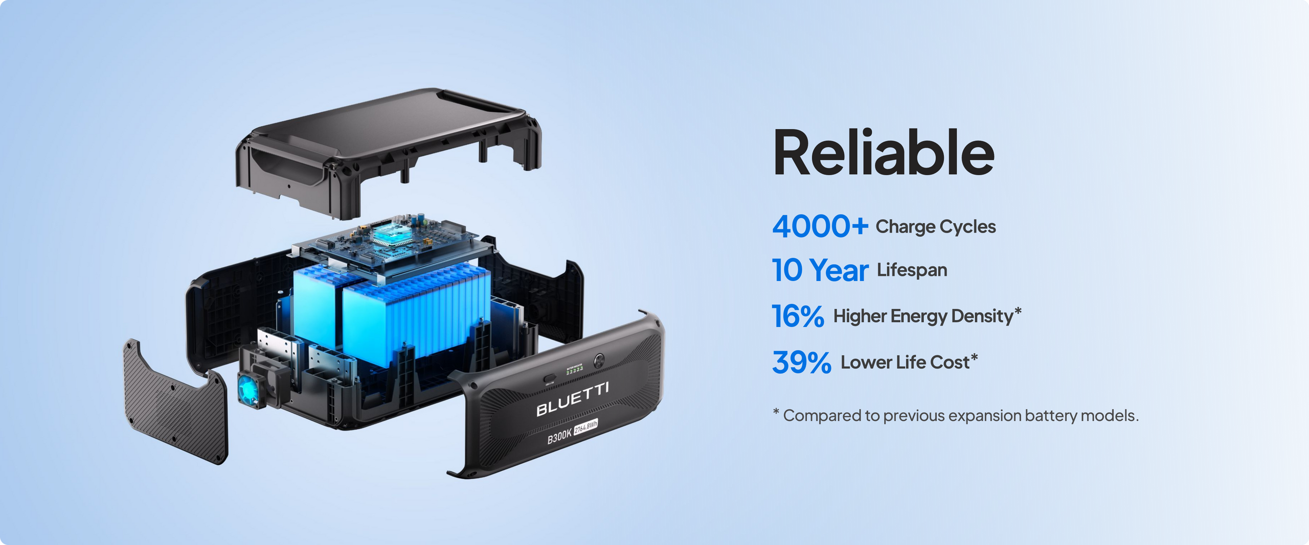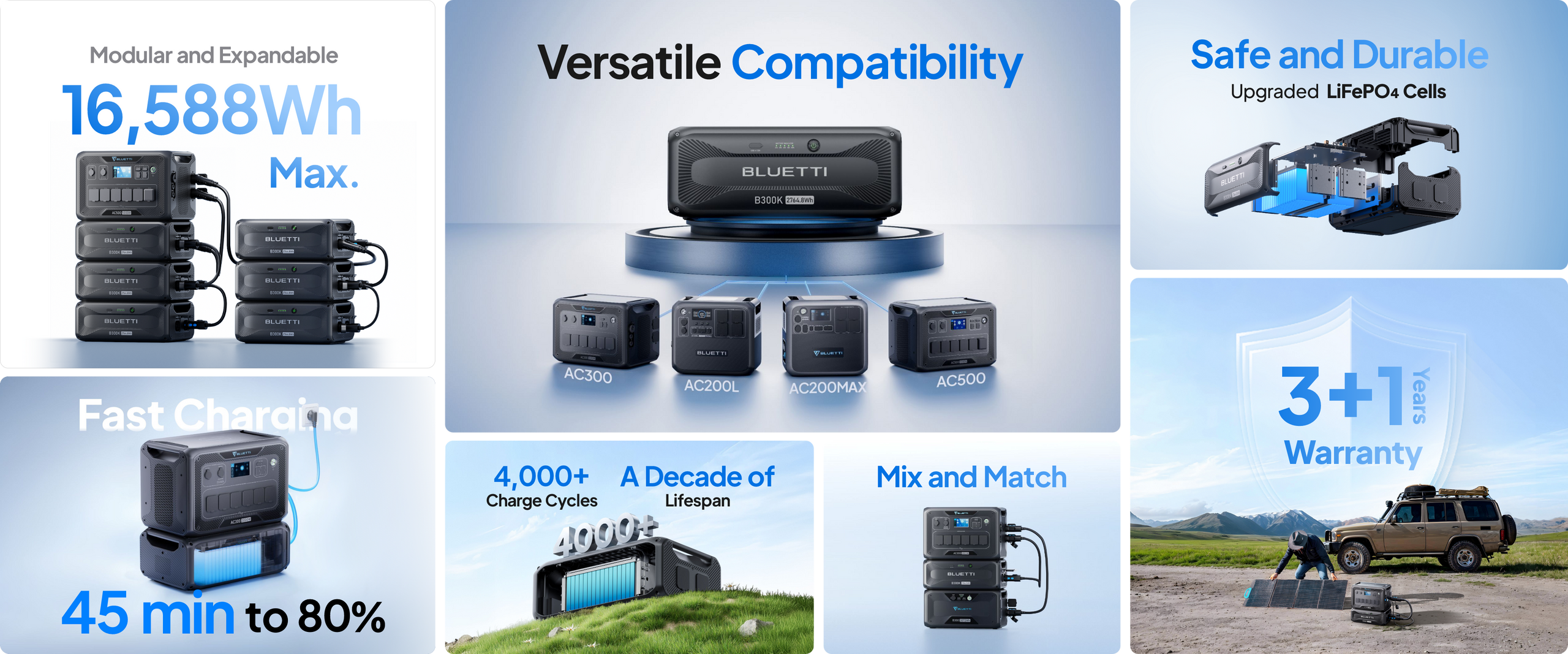 The B300K adapts to your life, whether you're safeguarding your home during outages or powering an off-grid adventure. Stack multiple B300K batteries, or mix and match with other BLUETTI batteries for a customized energy solution that ensures you're never caught without power, no matter where you are.