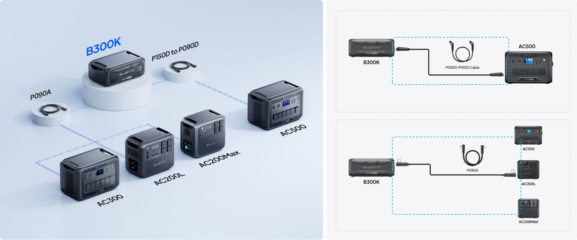 A: B300K is compatible with AC200L, AC200MAX, AC300, and AC500. The P090D to P150D cable is required for connecting with AC500 and sold separately. -