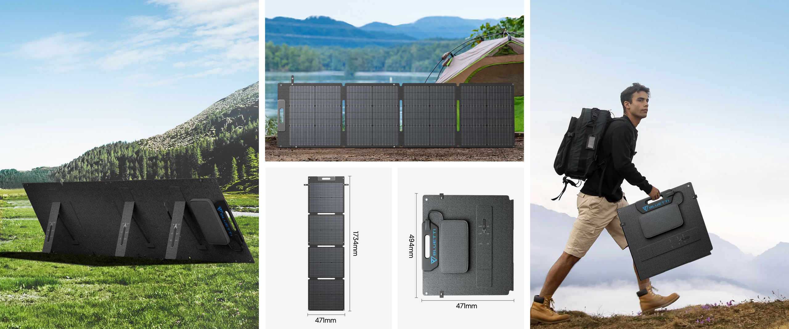 3pcs BLUETTI 120W solar panels can quickly charge the BLUETTI AC200P within 7-7.5 hrs by connecting them in series.