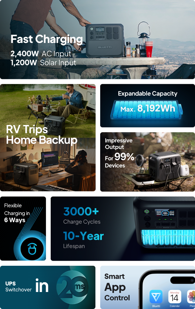 When paired with D40*, AC200L transforms into a high-efficiency DC power source, offering 12V/ 24V/ 48V seamless charging options for your RV batteries, as well as surveillances, routers, speakers, and radios at home or on the go.