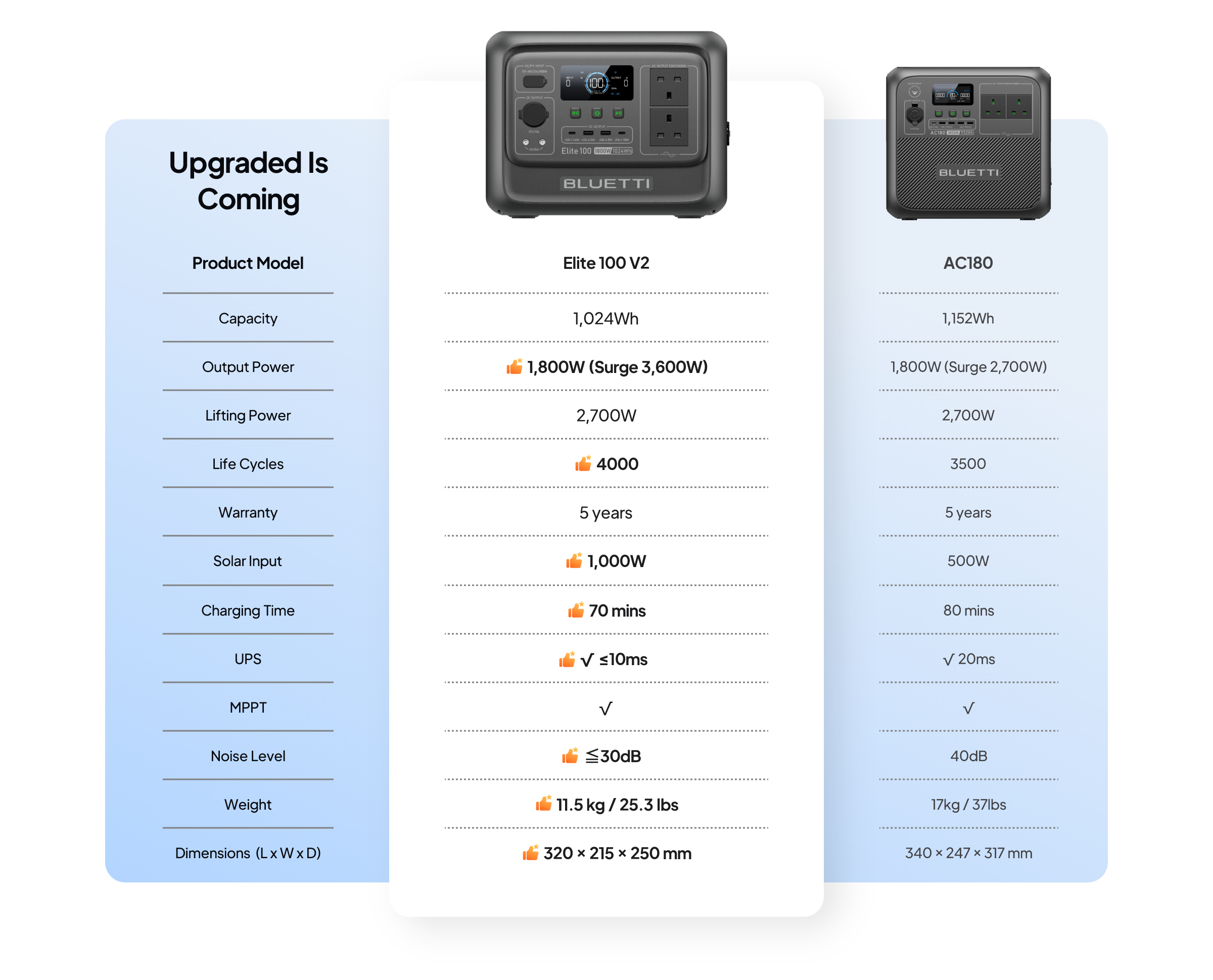 From travel-ready to power-hungry, the Elite 100 V2 portable power station is here to cover your needs with impressive output, blazing-fast recharges, efficient solar input, portable design and smart app control. Whether you're off-grid, off-road, or on-call during an outage, it handles it all without a sweat.