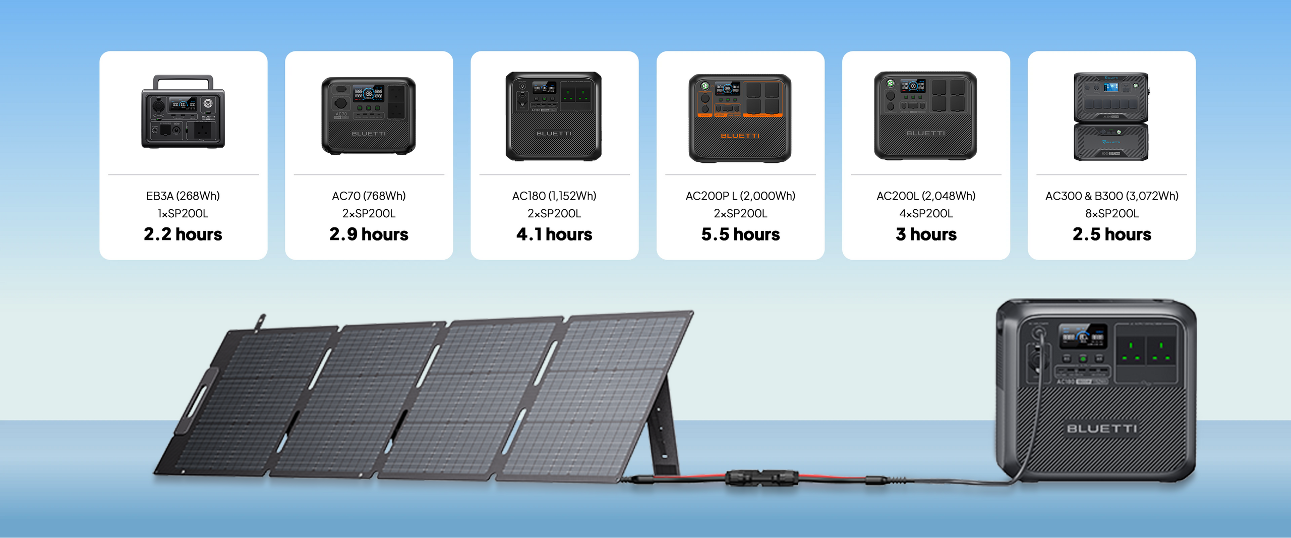 3pcs BLUETTI 200W solar panels can quickly charge the BLUETTI AC200P within 4.5-5 hours by connecting them in series.