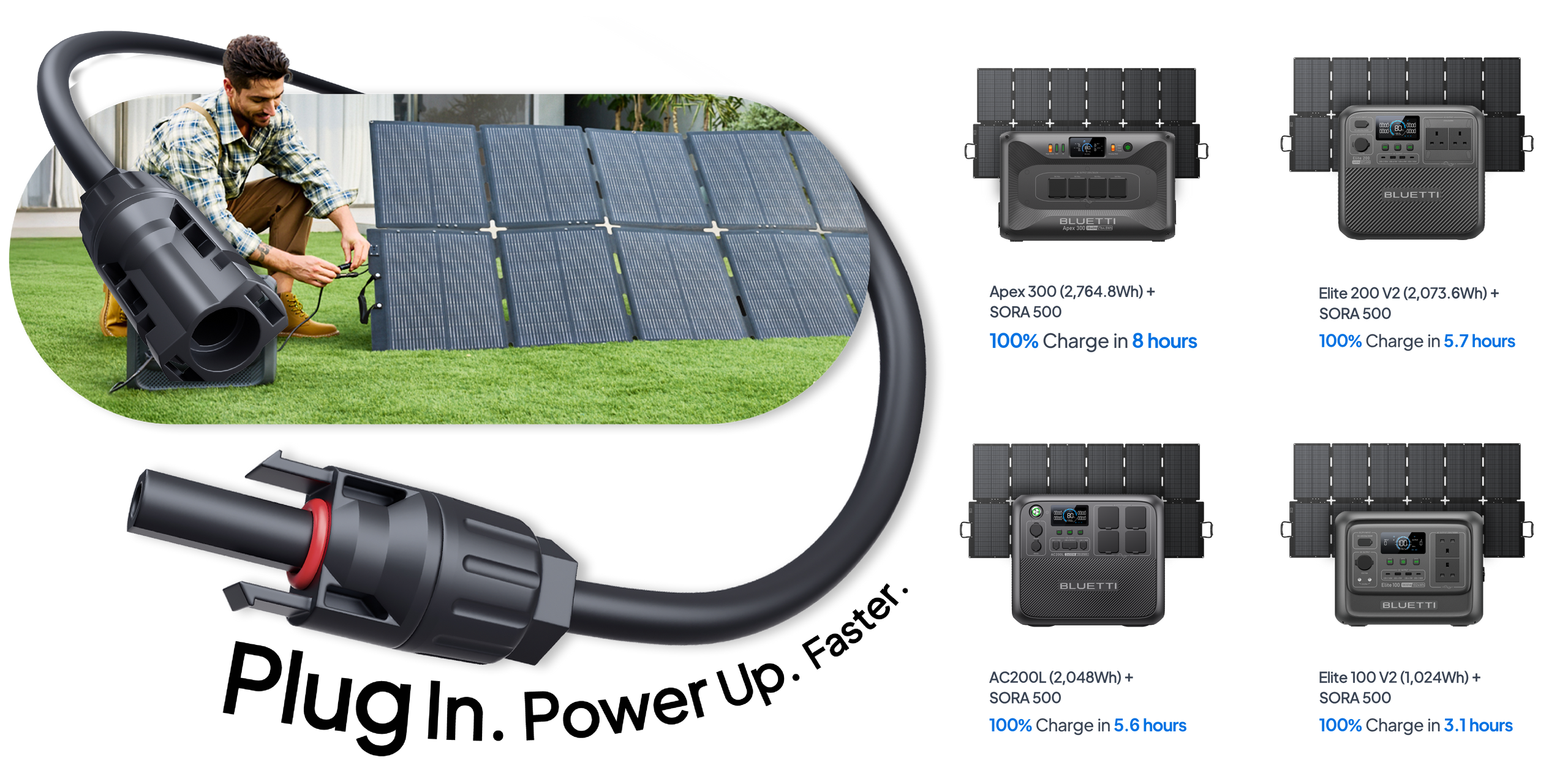 With a universal MC4 connector, SORA 500 works with almost any power station. Charge quickly, get back to adventure, and never wait for power again.