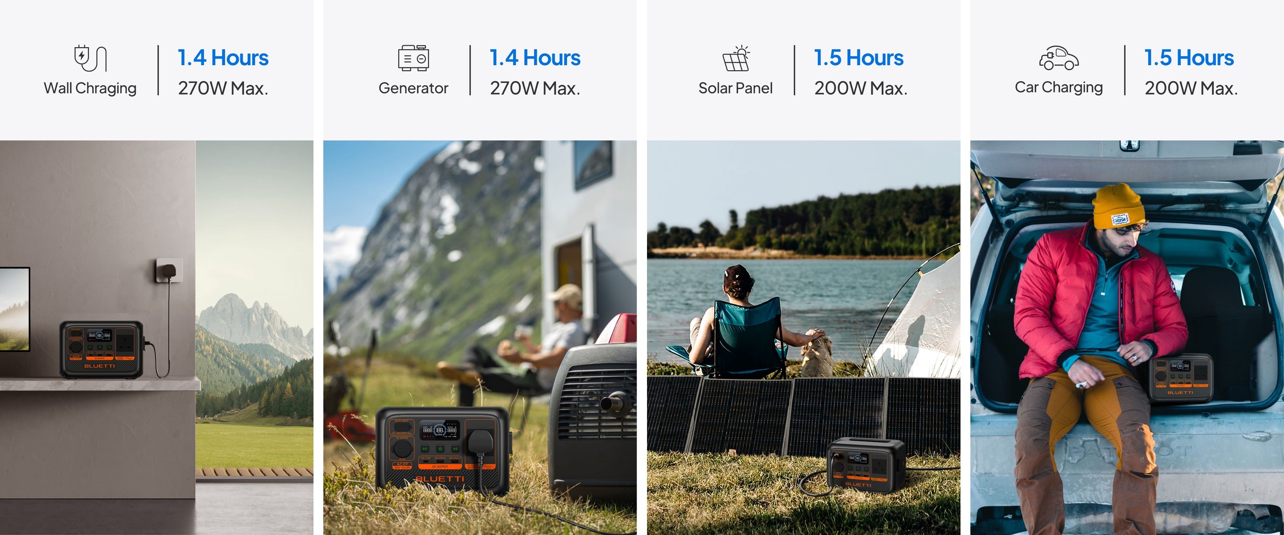 A: AC2P supports up to 270W AC input. Plug it into a wall outlet and enable the Turbo Charging mode on the BLUETTI App, and you can fill it up in only 1.2 hours. -