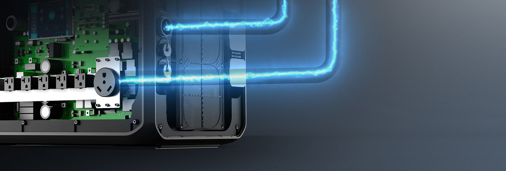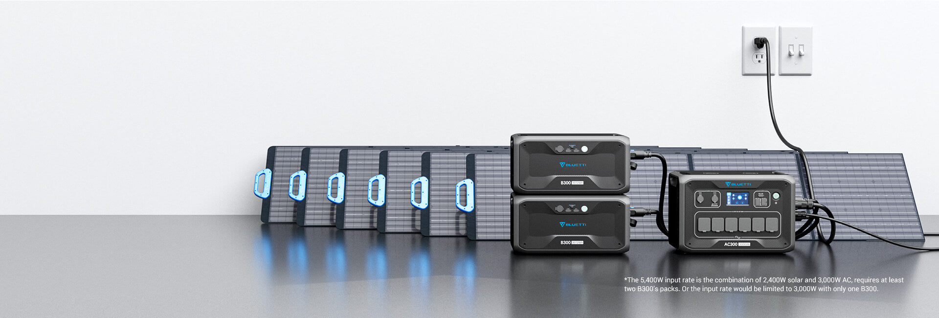 A:AC 300 is a non-battery inverter. It only has power when it is connected to B300. Recharge this unit through the Input charger of AC300 with the wall outlet and solar panels at the same time, then you will get a maximum 5,400W input.