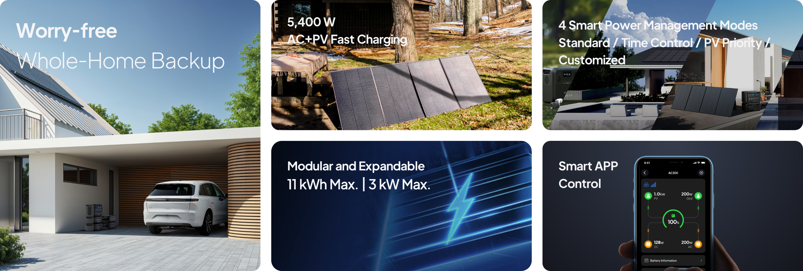 With 100% modular design, AC300 allows for a scalable capacity ranging from 2764.8Wh to a staggering 11,059.2Wh!