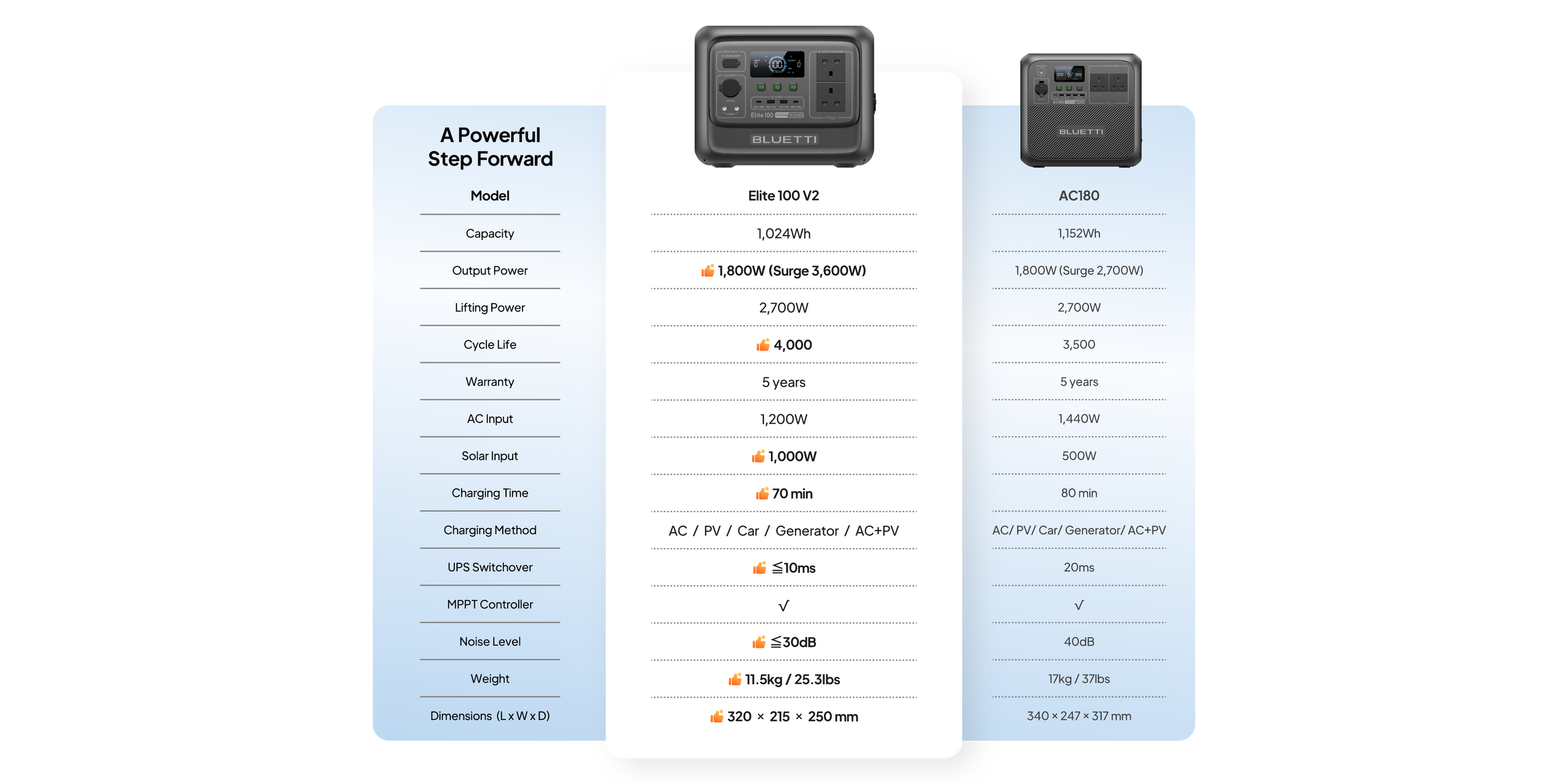 A:The Elite 100 V2 is BLUETTI's latest lightweight portable power station featuring a 1,024Wh capacity and 1,800W output. Whether you're facing a power outage, heading out for a camping trip, powering your RV, or backing up sensitive devices like CPAP machines, it's your go-to solution.