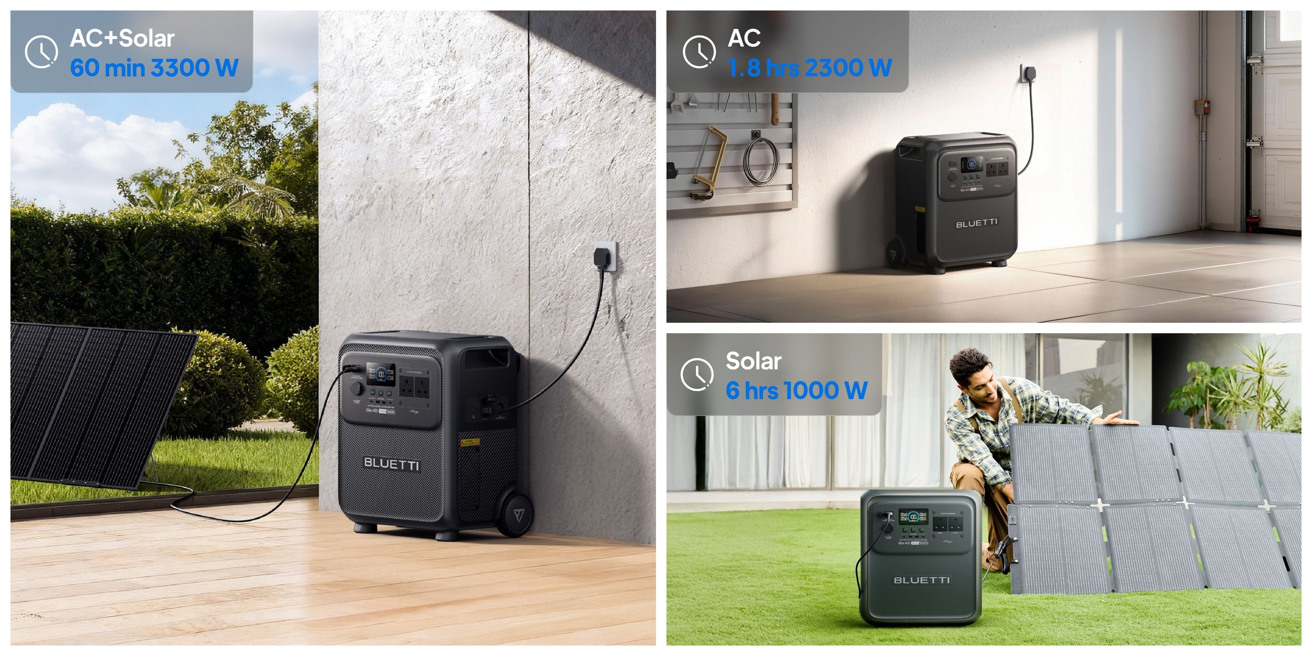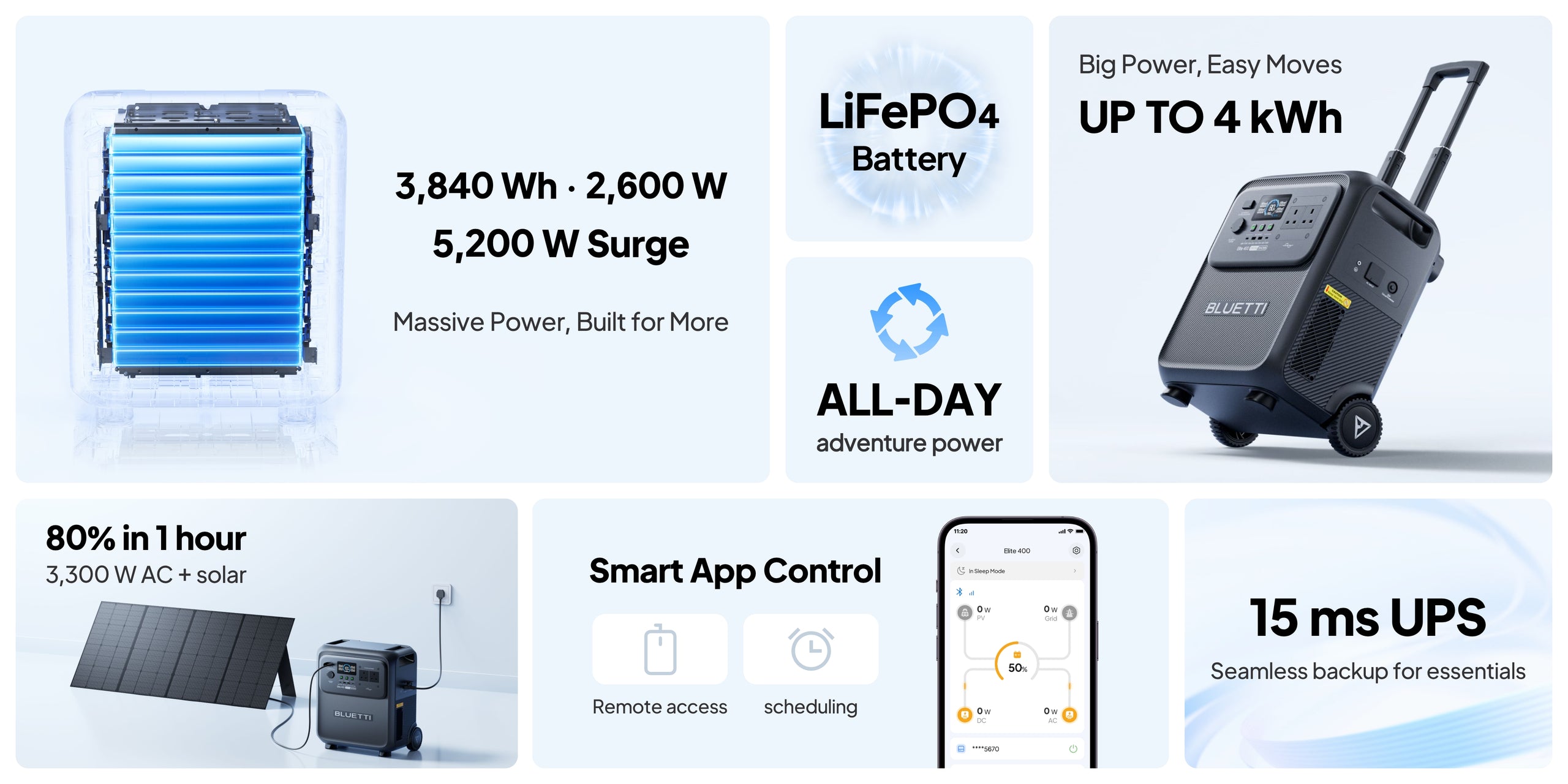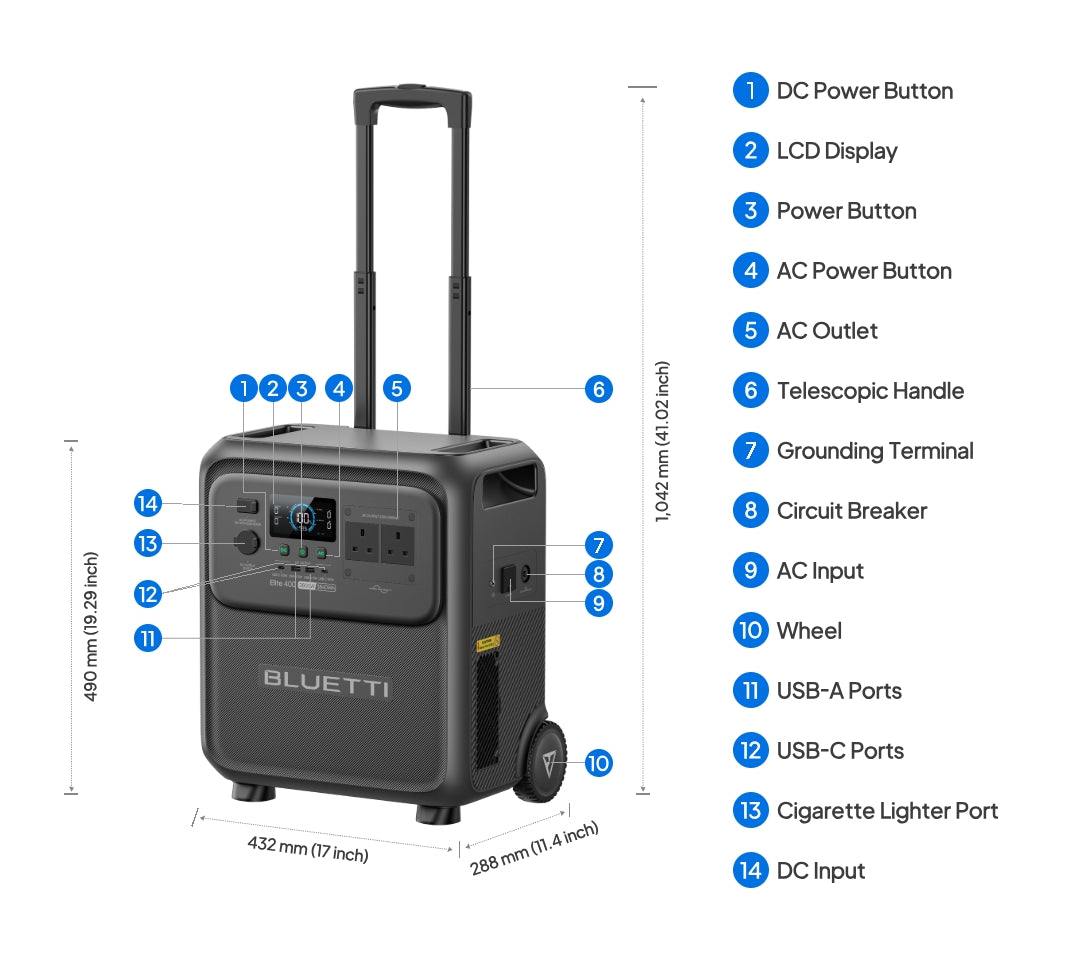 A:With 3.84 kWh capacity and 2,600 W power, the Elite 400 features a telescopic handle and wheels for easy mobility. It's perfect for: