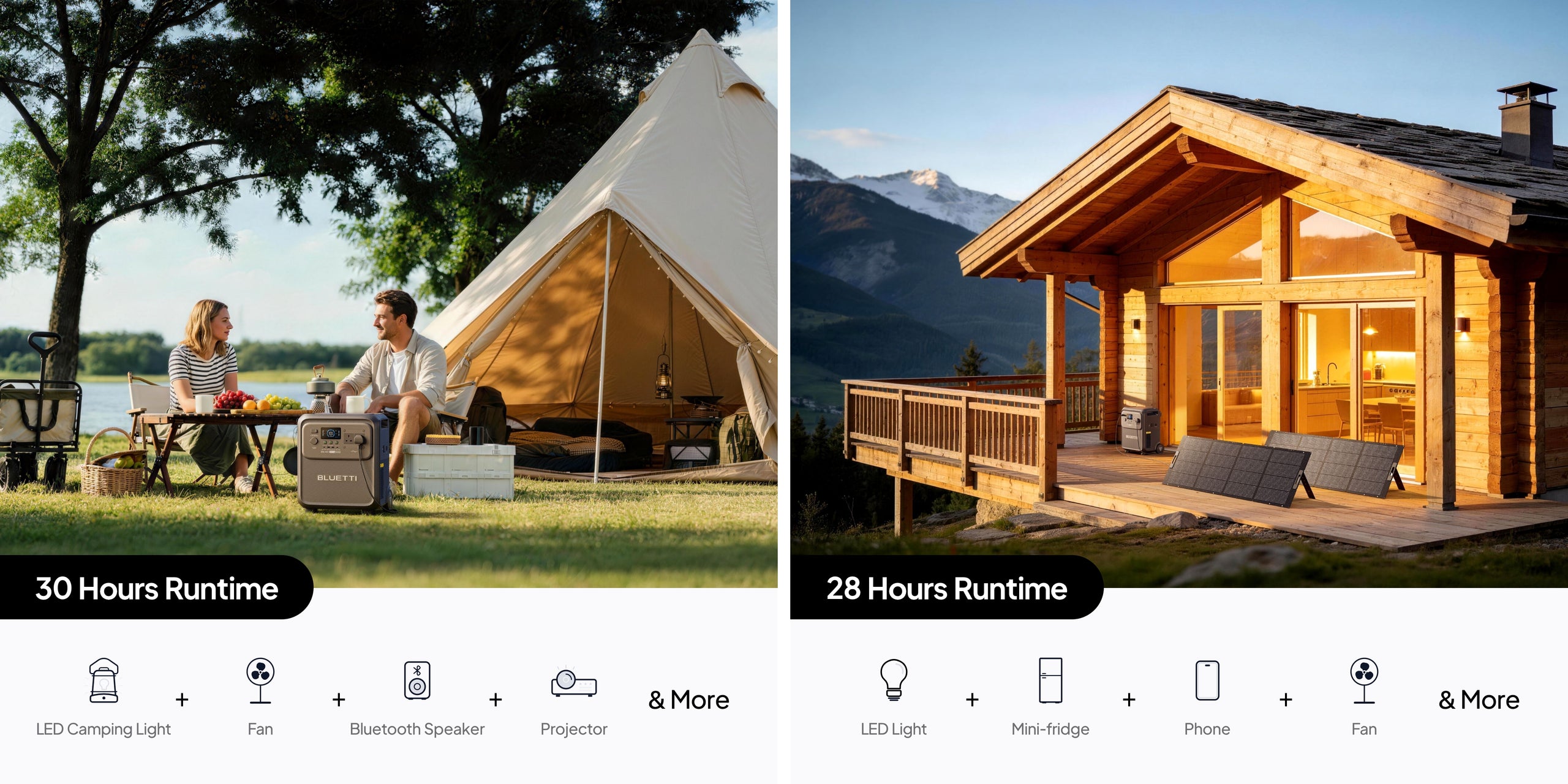 Bring your camp to life. Power your outdoor kitchen, lights, and movie nights — all in the quiet comfort of clean energy under the stars.
